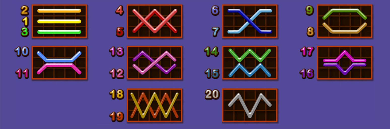 Tal como el mismo nombre del juego sugiere, esta tragamoneda posee 20 líneas diferentes de pago. Vale destacar que en favor de una ganancia, no resulta necesario cubrir todos los carretes, pudiendo percibir beneficio con apenas 3. Para una mejor comprensión de sus posibilidades, a continuación te muestros el resumen de las líneas de ganancias posible que exhibe el desarrollador: