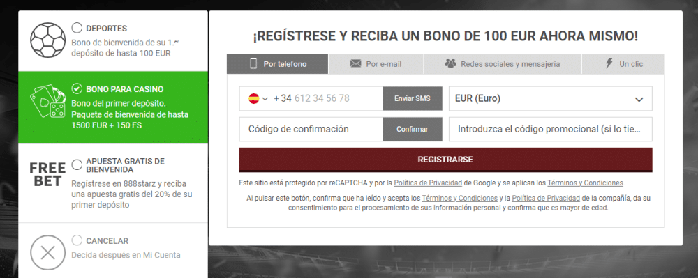 El siguiente paso consta de cumplir con el registro. Este es simplemente un formulario que se deberá llenar con la información básica del usuario. Para acceder a él, navega hasta la página principal del casino y selecciona “Registrarse” en la esquina superior derecha.