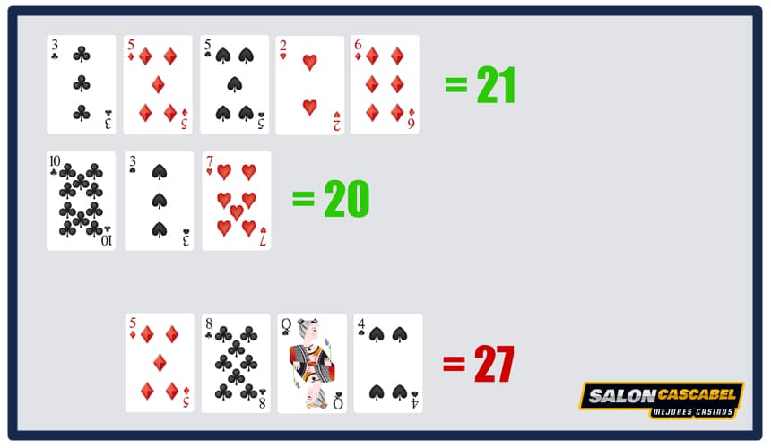 Veintiuno o blackjack. Cuando tus cartas forman una combinación que sumen 21.