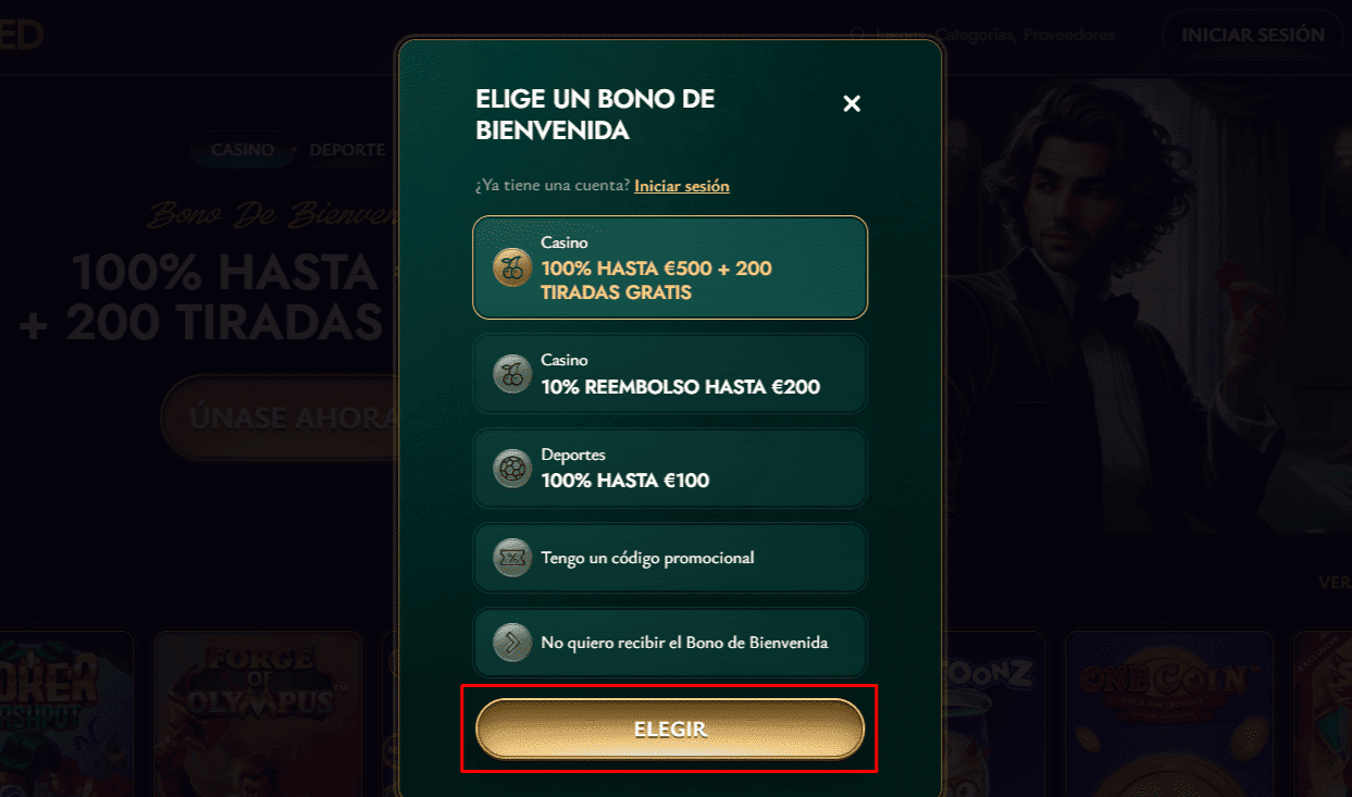Lo primero a seleccionar es el bono de bienvenida que deseas recibir o ingresar un código promocional.