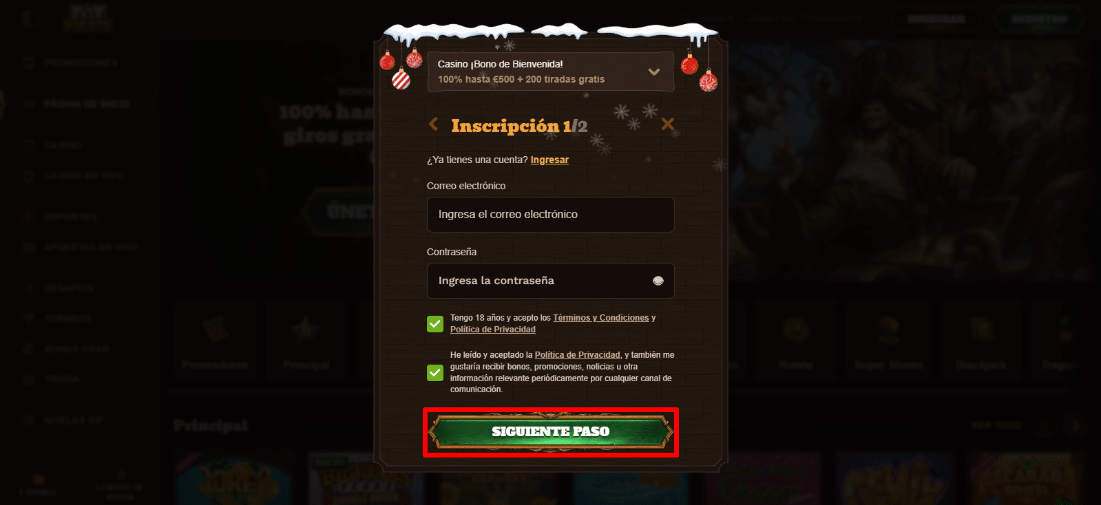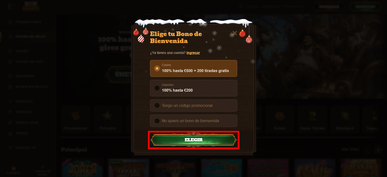 Seleccionar un bono de bienvenida: las opciones son el bono de bienvenida del casino, el de deportes, usar un código promocional o rechazar la bonificación. Cuando hagas una selección, presiona “Elegir”.