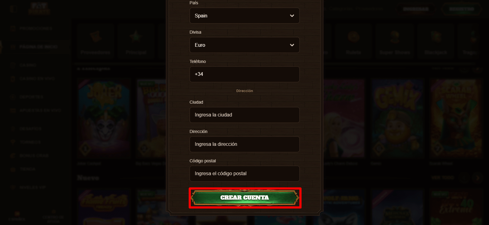 Completar el formulario: está compuesto por tu nombre y apellido, fecha de nacimiento, género, divisa, número de móvil y dirección. Cuando completes esta información, pulsa “Crear cuenta”. Con esto tu cuenta estará lista.