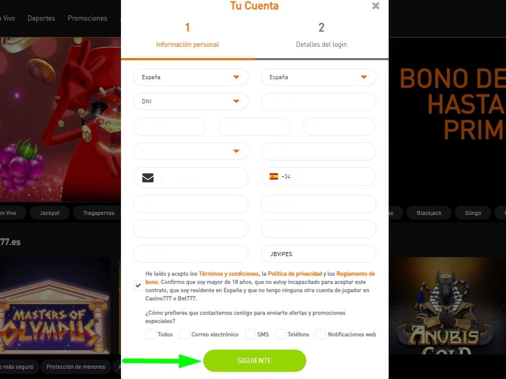Escribir el código promocional o de afiliado: ingresa el código promocional en el último campo de la primera sección del formulario, acepta los términos y haz clic en “Siguiente”. Crear tu usuario: establece un nombre de usuario y contraseña en la última parte del formulario y haz clic en “¡Regístrate ahora!”.