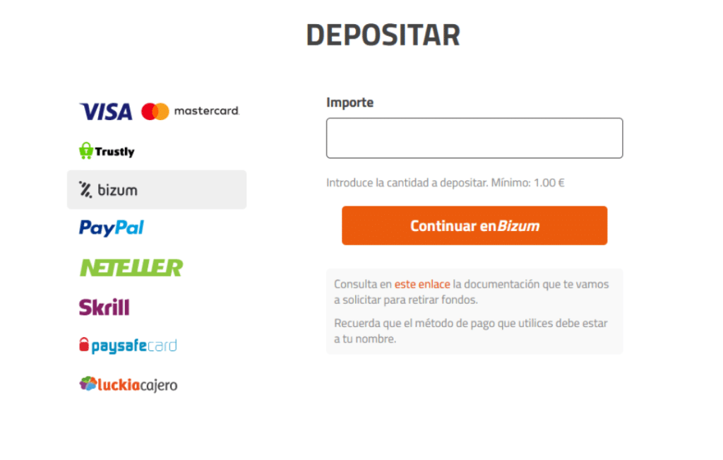 Ahora hay que seleccionar Bizum como método de pago e ingresar la cantidad de dinero que quieres depositar. Ahora haz click en “depositar”. En casinos como Luckia o Betway, por ejemplo, este método nos permite realizar los depósitos mínimos más bajos, como el de 1 euro, así que es una gran ventaja para los jugadores. La cantidad de depósito máximo, eso sí, estará restringida por el propio sistema de pago, siendo la operación máxima de 500 euros al día. Por tanto, no podremos realizar un depósito por encima de esa cantidad si escogemos este sistema.