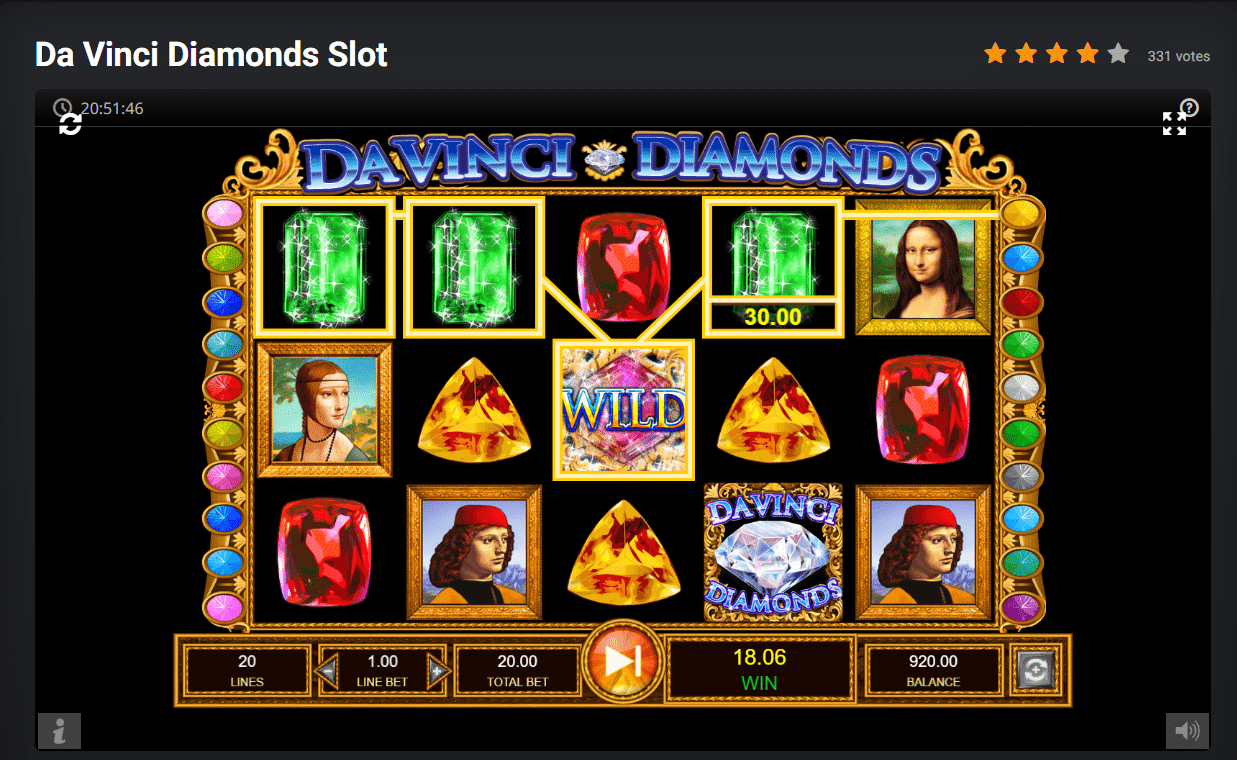Como se ha mencionado, DaVinci Diamonds cuenta con 20 líneas de pago. Gracias a esto, la posibilidad de ganar siempre está latente. Un punto a destacar es que basta con tan solo 3 símbolos para que el juego ofrezca algún beneficio. Esto es un rasgo que seguramente los fanáticos de las tragamonedas sabrán apreciar.