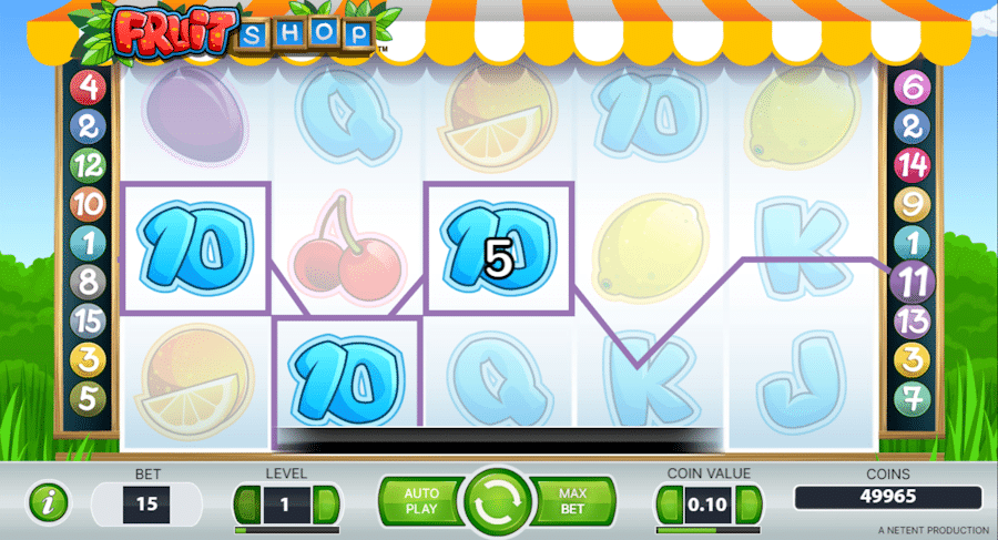 Para ajustar el importe de la apuesta en Fruit Shop slot tienes dos parámetros, el primero es el nivel de juegos por el cual se establece el importe general de la apuesta en monedas. También puedes elegir el total de monedas a jugar, con lo que quedaría ajustado el importe de cada partida y, en consecuencia, los premios que puedes conseguir.