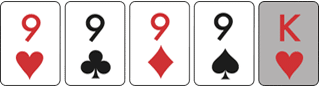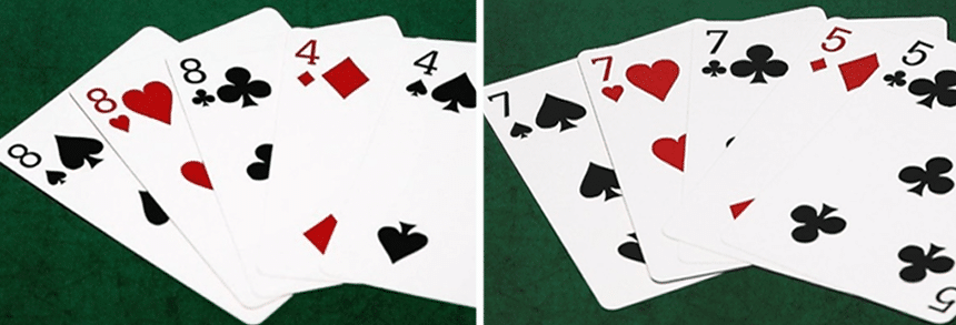 En este movimiento, la prioridad es el valor del trío formado. Para que te des una idea, te dejo las jugadas de mayor a menor valor. Ten en cuenta que la combinación repartida más alta, es la que ganará siempre que se encuentren dos fulles en mesa. En este caso, el full formado por los naipes 8-8-8-4-4 le gana al 7-7-7-5-5