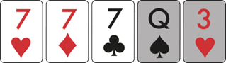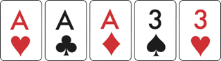 Un Full House es una combinación de cinco cartas dividida en un trío (tres cartas iguales) y un par (dos cartas iguales). Esta jugada es llamada bote lleno o bote por algunos jugadores. Durante el juego de póquer, esta mano es considera muy fuerte y, por lo general, es una mano ganadora. Pero hay que tener en cuenta que, a pesar de que esta combinación supera a muchas otras jugadas en el póquer, no es imbatible. Te dejo un ejemplo gráfico de como formar un Full House.