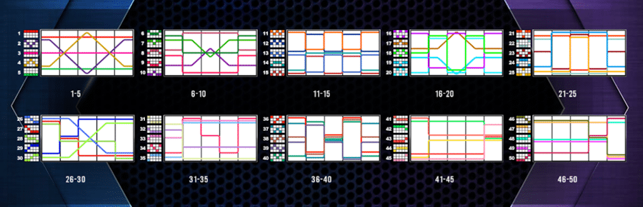 Las 50 líneas de pago de esta slot abren la posibilidad de tener más alternativas de combinaciones con premio. Estudia la tabla para estar al tanto de las posibles jugadas que se formen en la pantalla.