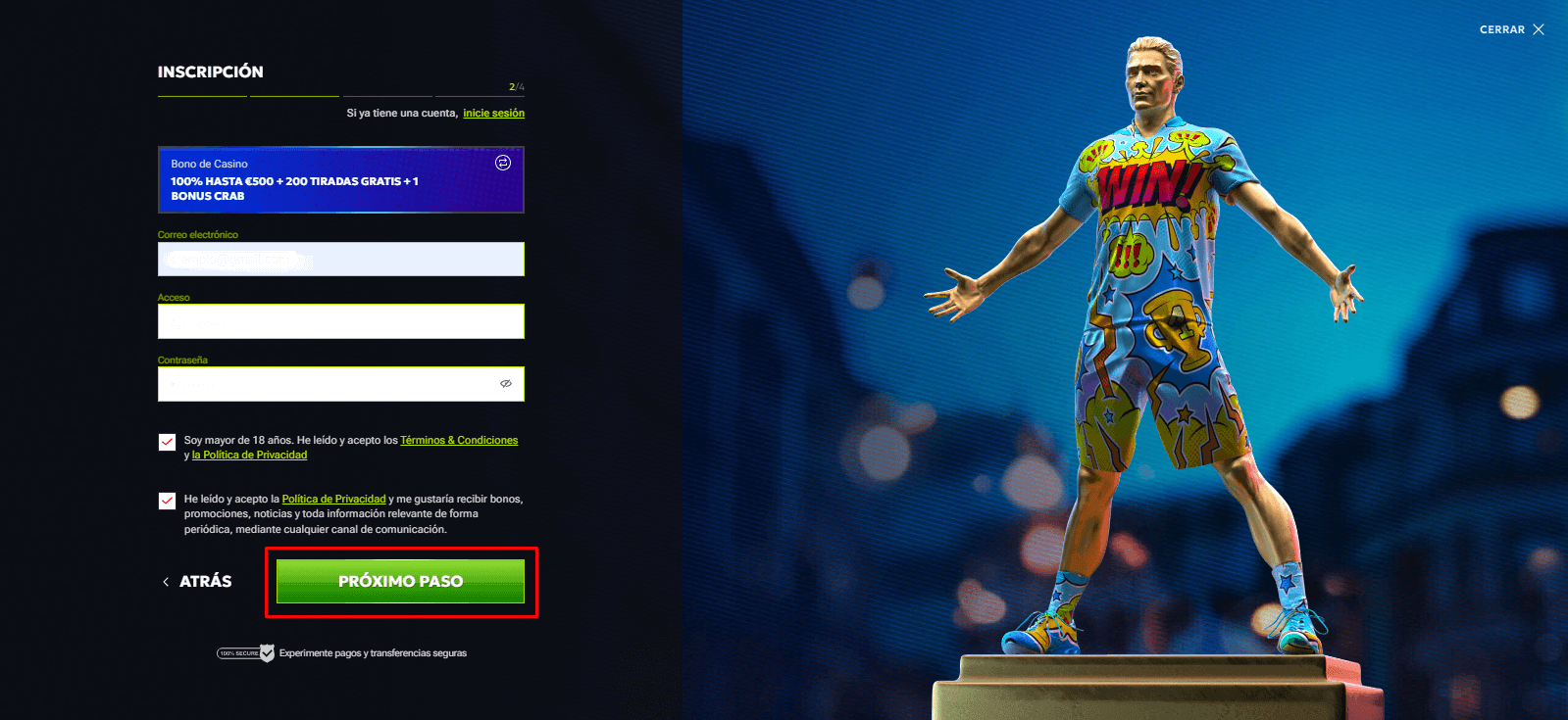 Escribe tu dirección de correo electrónico, un nombre de usuario y contraseña para que puedas hacer clic en “Próximo paso”.