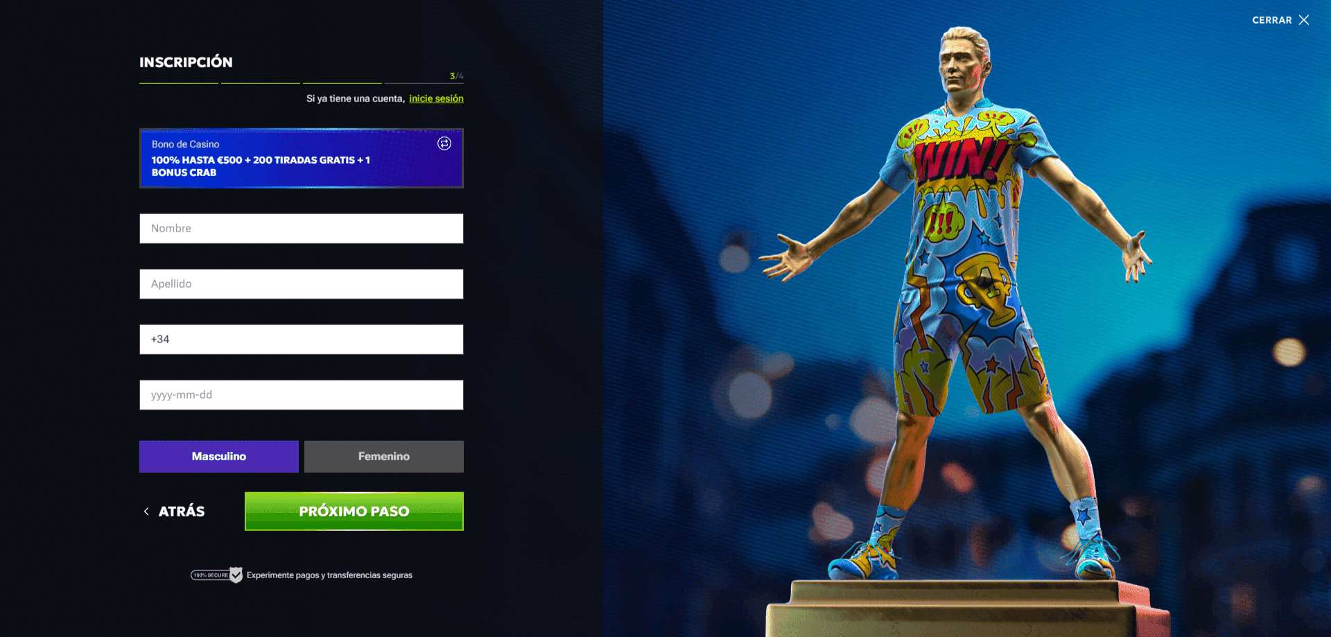 100 % de tu primer depósito, hasta € 500 + 200 giros gratis + 1 bonus crab