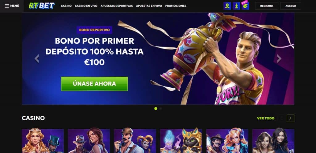 Desde el primer momento en que se entra a la página web de RTbet Casino destaca por tanto en sentido estético como en el funcional. En ella se combinan los tonos oscuros con los vibrantes y la plataforma carga rápido, así que es cómodo navegar en ella.