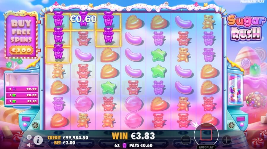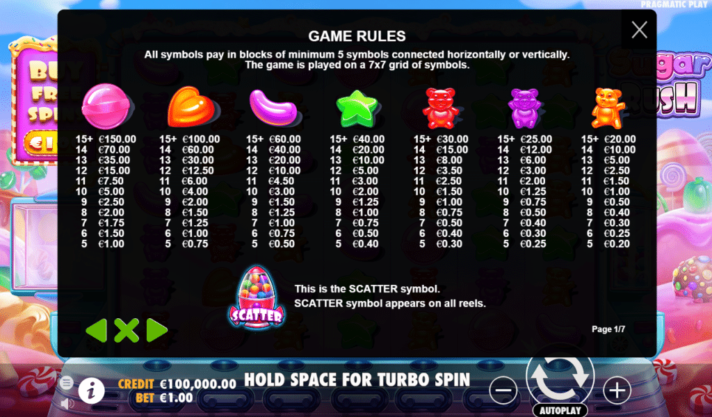 Como suele ocurrir en este tipo de juegos, Sugar Rush es muy sencillo e intuitivo, tanto que en apenas unos minutos habremos aprendido a manejarnos por completo dentro de su interfaz. Es una slot grande, con un tablero de 7×7, con siete carretes y siete filas. El objetivo del juego es conseguir que al menos cinco figuras iguales queden alineadas de forma adyacente. Da igual si es de forma vertical, horizontal o diagonal, siempre que el símbolo que tenga al lado sea el mismo.