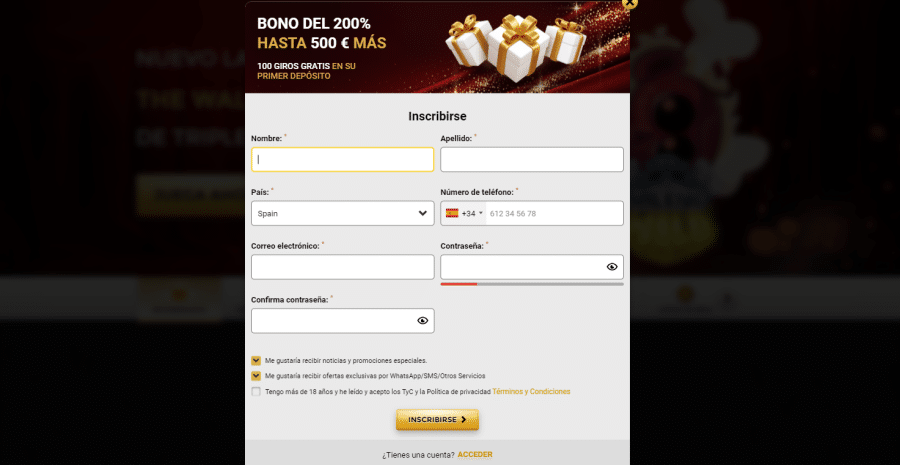| 🎁200% del primer depósito hasta 500€ + 100 giros gratis | Registrarse y hacer un primer depósito de, al menos, 15 €. |